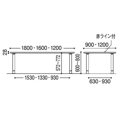 天板のエッジに赤ラインが付いていますので、テーブルの位置確認がしやすくなっています。
