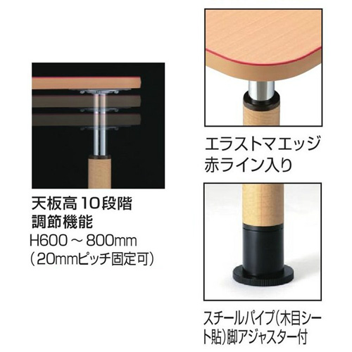 ■材質:天板=メラミン化粧板、芯材=パーティクルボード(枠組みペーパーハニカムコア)、エッジ=エラストマエッジ・赤ライン入り、脚=Φ60.5mmスチールパイプ(木目シート貼)、アジャスター付