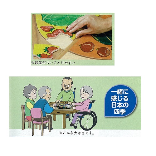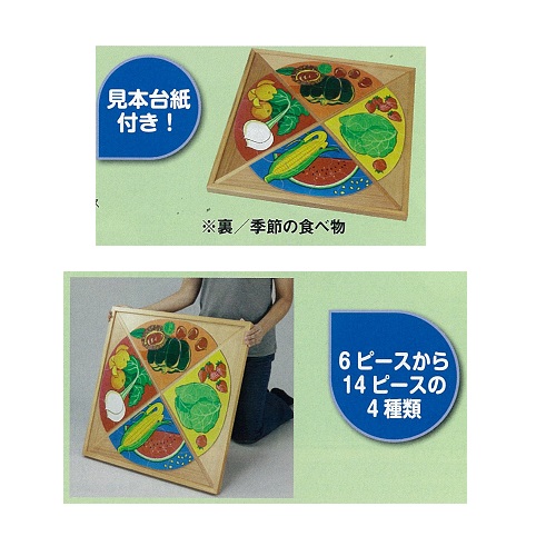 ●内容:春14ピース/桜の花、苺とキャベツ 夏10ピース/花火、西瓜ととうもろこし 秋12ピース/中秋の名月、柿と南瓜 冬6ピース/凧、みかんとかぶ
