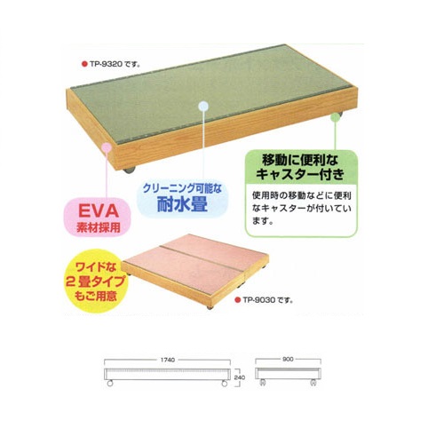 【商品説明】 ●一畳タイプ ●材質:EVA(木目調)・耐水畳 ●脚部:キャスター(ダブルストッパー付)4個 ●許容荷重:一畳/200kg
